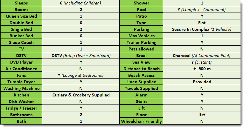 Providence 40 is a 2 Bedroom, 2 Bathroom, self catering holiday unit and is perfectly situated in Ramsgate with picturesque views of Ramsgate Blue Flag Main Beach [+-500m walk], with the lagoon a few meters away. Within short distance to lots of Restaurants & Pubs.